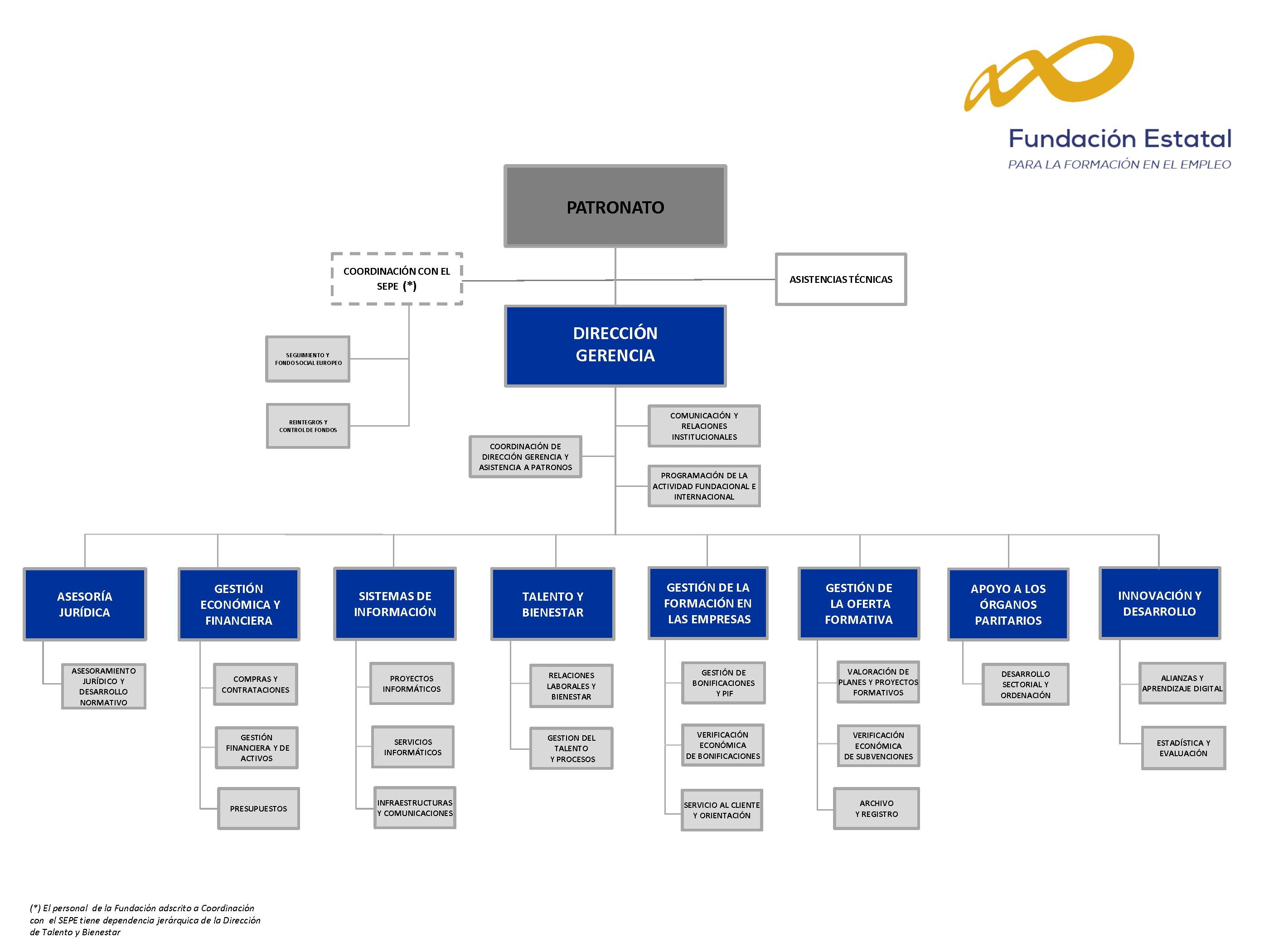 La estructura responde al organigrama que verás al final de la página. Las funciones de Fundae se establecen por ley y se recogen en un plan de actuación anual.